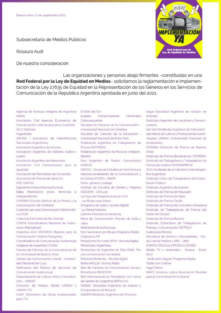La Ley de Equidad en Medios -que promueve la democratización de la estructura laboral- fue aprobada en junio del 2021 y se preveían 90 días para su reglamentación, pero esto aún no sucedió. Por esta razón se conformó esta Red Federal para lograr avances en este aspecto.