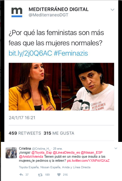 En España, en enero de este año la usuaria de Twitter Cristina Hernández logró, a través de esa red social, que cuatro importantes empresas retirasen su publicidad del periódico online Mediterráneo Digital por la publicación de una nota de claro corte machista titulada «¿Por qué las feministas son más feas que las mujeres normales?». Luego de dar con este ofensivo artículo, Hernández tomó capturas de pantalla de cinco banners publicitarios que aparecían en la web, solicitó a cada una de las marcas que dejaran de pautar en el medio digital e invitó a sus seguidoras/es a que apoyaran la iniciativa. Las respuestas llegaron de inmediato. Las automotrices Toyota y Nissan y la inmobiliaria Anida Vivienda –del grupo BBVA- comunicaron que procedían a retirar sus campañas de la mencionada web. La compañía de seguros Línea Directa, luego de analizar la situación, también decidió dar de baja su pauta publicitaria y expresó en la red social: «Retiramos la publicidad de Mediterráneo Digital, ya que en ningún caso queremos que nadie se sienta ofendido». Sólo la compañía aérea Norwegian Airlines postergó la decisión alegando que la aparición de su publicidad en la web del periódico no avala las opiniones allí manifestadas y que más bien se debe al uso de estrategias de colocación de anuncios basados en el historial de navegación del usuario/a.